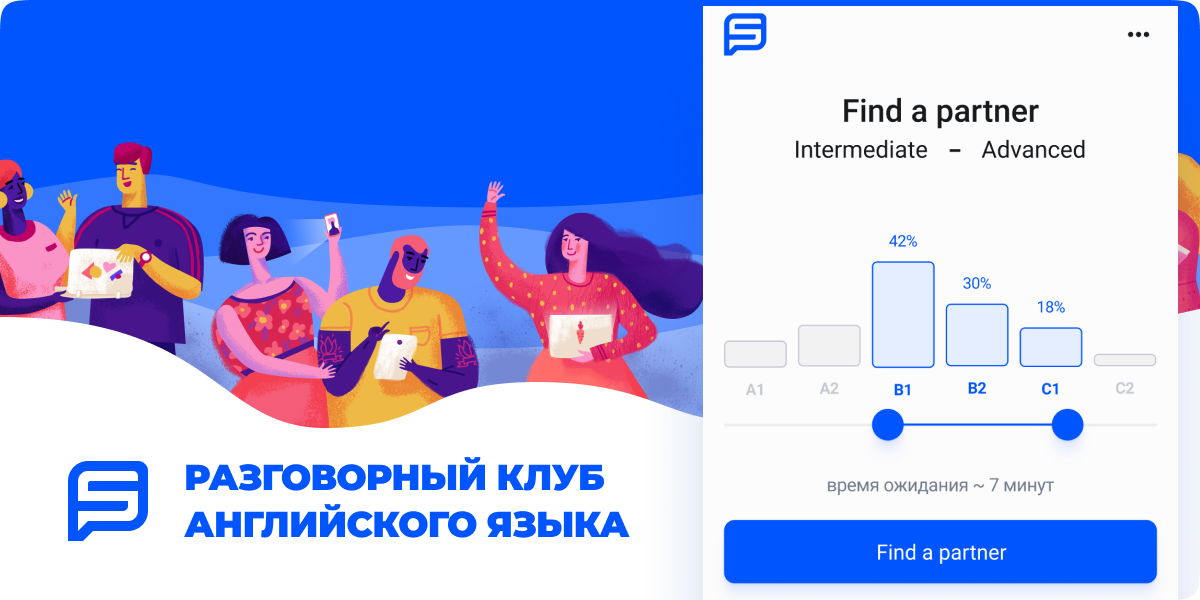 Система быстро подберёт вам собеседника по уровню и интересам. Заходите, когда вам удобно, и практикуйтесь!