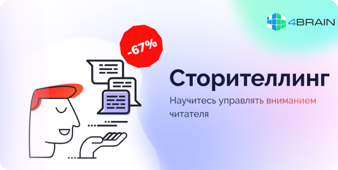 Сторителлинг — это не только про рассказы и сказки. Это еще и инструмент, который помогает управлять вниманием и учит интересно говорить. В 4BRAIN сейчас действует суперскидка 67% на курс по сторителлингу! | |