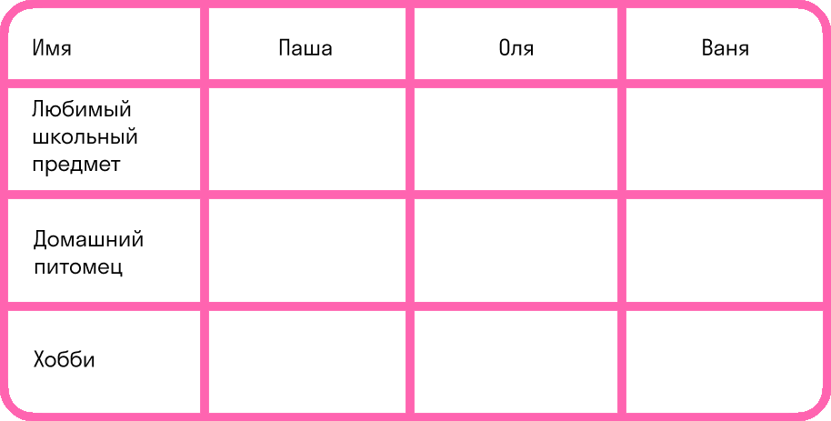 | | | А теперь распредели предметы, животных и хобби между тремя ребятами. Предметы: география, история, литература. Животные: корги, рыбки, черепаха. Хобби: шахматы, гитара, теннис. | | | | | | | До встречи! Команда Skysmart | | | Задайте вопрос на сайте или скачайте приложение Skysmart | |