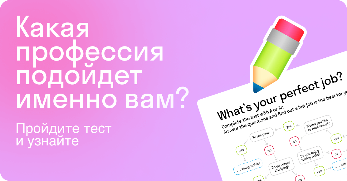 | Наша первая домашка проверяет ваше знание неопределенных артиклей a и an и заодно в шуточном тесте помогает определиться с работой мечты. Мне вот посоветовали стать подкастером, я давно мечтала! | |