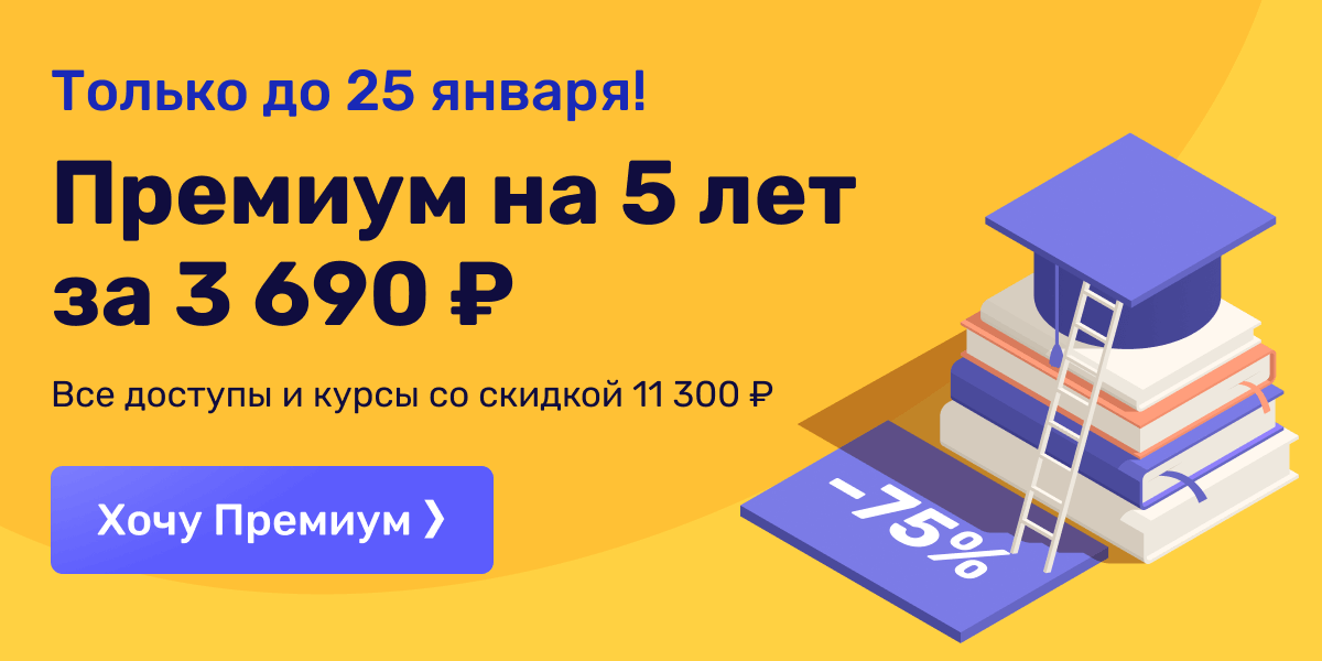 | Подключите Премиум на 5 лет со скидкой 75% и получите бесплатный урок с преподавателем! Можно купить в подарок, а ещё можно в рассрочку без переплат. Только до 25 января!