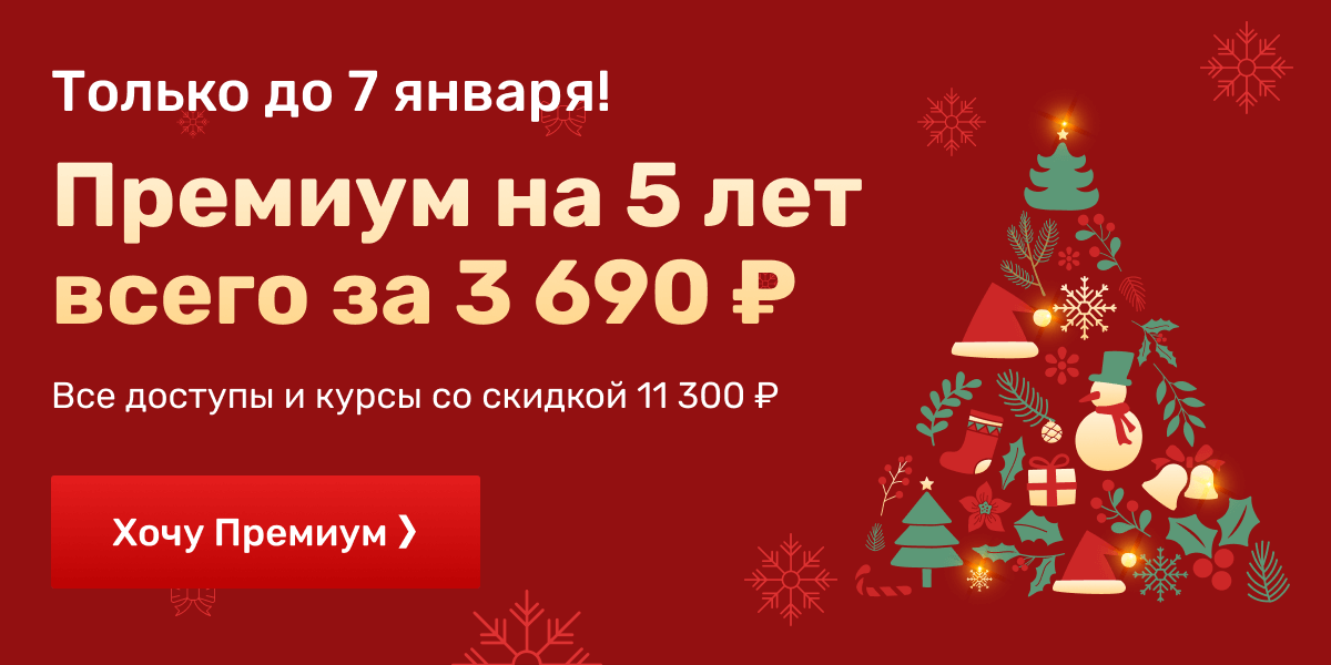 | Подключите Премиум на 5 лет со скидкой целых 75% и получите бесплатный урок с преподавателем! Можно купить в подарок, а ещё можно в рассрочку без переплат. Только до 7 января!