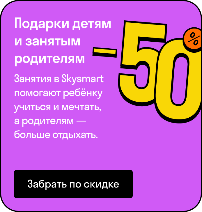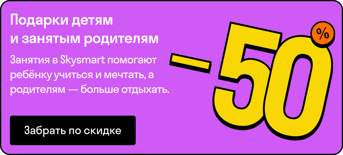 | | | | | | | Снова игрушки, конфеты, наряды и гаджеты? Неееет, в этот раз будет по-другому! | | | Дарите подарки со смыслом: они внесут вклад в будущее ребёнка и помогут реализовать его мечты. А чтобы дарить было приятнее — воспользуйтесь скидкой до 50% по промокоду VESNA22 на уроки по школьным предметам, подготовке к экзаменам и занятия для дошкольников. | | | | | | | | Подарки от Skysmart каждому! | | Переходите на сайт и забирайте полезные презенты, которые помогут в образовании и воспитании ребёнка: | | | | методичка «Домашнее задание без слёз», чтобы учёба перестала быть причиной домашних конфликтов; | | | | | математические комиксы, чтобы ребёнок полюбил математику через игры и головоломки; | | | | | настольная игра на английском, чтобы расширить словарный запас и весело провести время. | | | | | До встречи! Команда Skysmart | | | Задайте вопрос на сайте или скачайте приложение Skysmart | | | | Вы получили это письмо, так как подписаны на рассылки Skysmart. Чтобы перестать получать письма, перейдите по ссылке. | | |