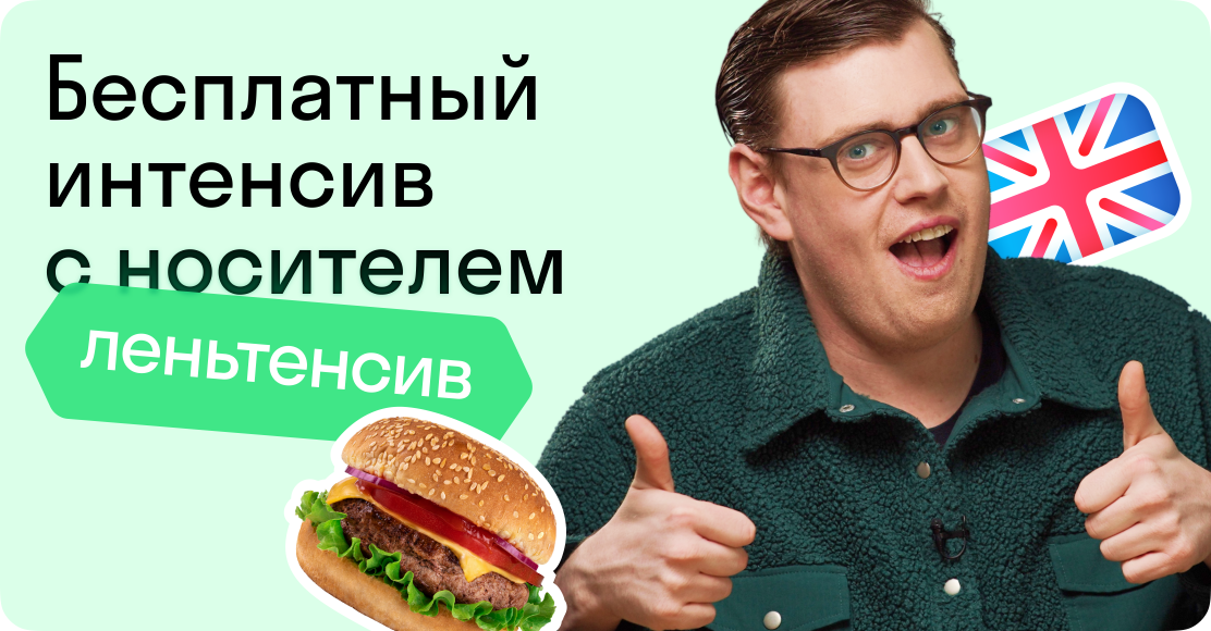 | | | | | | Да, английский под силу и ленивым. Чтобы доказать это, мы создали интенсив с носителем языка Дэни, в котором делимся 10 лайфхаками для ленивой учебы. Разумеется, без зубрежек, домашек, занудных лекций и вот этого всего. На курсе вы: |