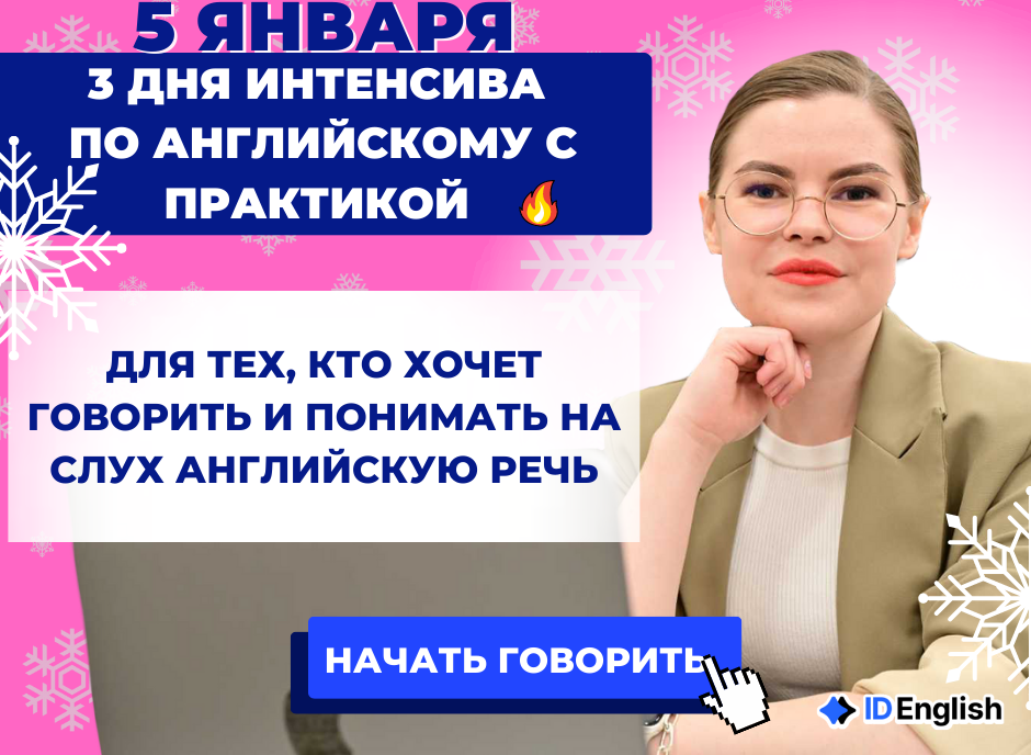 Вы проходили мои уроки и вебинары по английскому языку пару месяцев назад, помните? 5 января я провожу новый новогодний интенсив для начинающих, с разговорной практикой, на котором мы учимся понимать на слух и говорить! За 3 дня, даже с полного нуля, вы сможете 20 минут поболтать на английском, поймете собеседника и расскажете о себе! По-английски!Для вас, как для моего давнего подписчика, доступен бесплатный билет №573: | | | | Программа новогоднего интенсива: День 1: Система. Как учиться, чтобы выучить? Запомним навсегда 15 фраз, поймете как учить, чтобы не забывать.