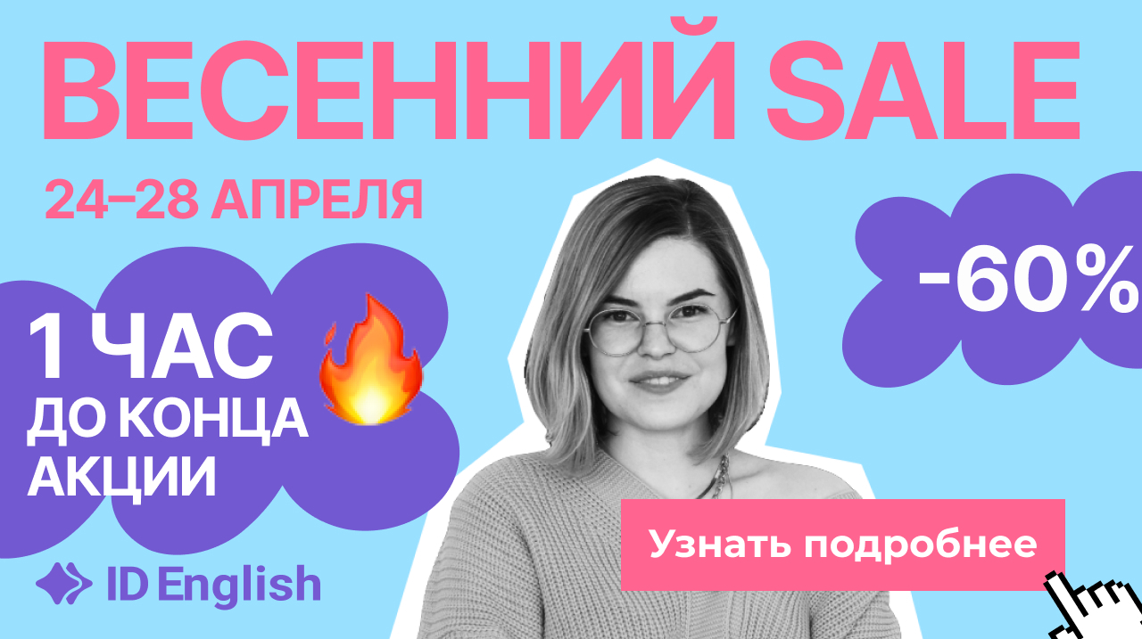 Распродажа закончится через 1 час. Успейте забрать свой курс английского со скидкой 60% и заговорить на английском в этом году. Запрыгивайте в последний вагон, чтобы не кусать локти завтра ➡️ вперед навстречу возможностям и мечтам.