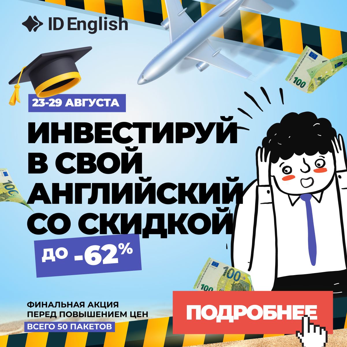 5️⃣ А еще сейчас самое время перестать просто тратить деньги и время на зубрежку и наконец заговорить на английском, с гарантией и даже с нуля. Потому что только с 23 по 29 августа в нашей школе пройдет большая распродажа курсов английского. Которую мы назвали «Инвестиция в английский язык со скидкой до -62%!» |