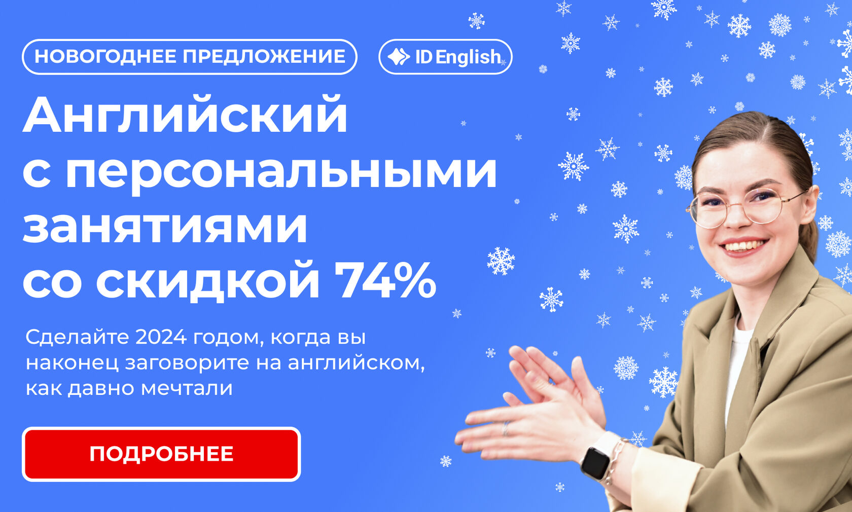 | Мы открываем новогоднюю распродажу - курс английского языка с персональными занятиями и выгодой до 74%. Только с 20 по 26 декабря. Только 60 счастливчиков получат скидку. Подарите себе навык свободно говорить и понимать по-английски! Без зубрежки, долгих занятий в неудобное время и огромных домашек.