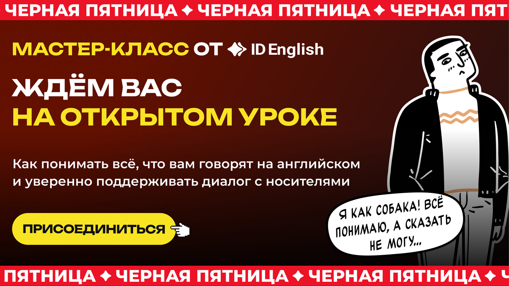 Уже через 1 час мы перевернем ваше представление о том, как можно учить английский. Вы узнаете:⏩ Как заниматься с удовольствием, а не из-под палки. ⏩ Как начать сейчас и спокойно освоить язык. А не экстренно, когда петух клюнет. ⏩ Как наконец перестать забывать и просто общаться на английском. ⏩ Поймете, что вам мешало освоить язык все эти годы. Чтобы больше не тратить время на то, что не работает. Записи урока не будет! Присоединяйтесь к эфиру прямо сейчас. А пока все собираются, мы включили отличную музыку для хорошего настроения. | | | | ❤️ Чуть не забыли сказать. 10 участников прямого эфира получат от нас презент – тренинг по произношению.