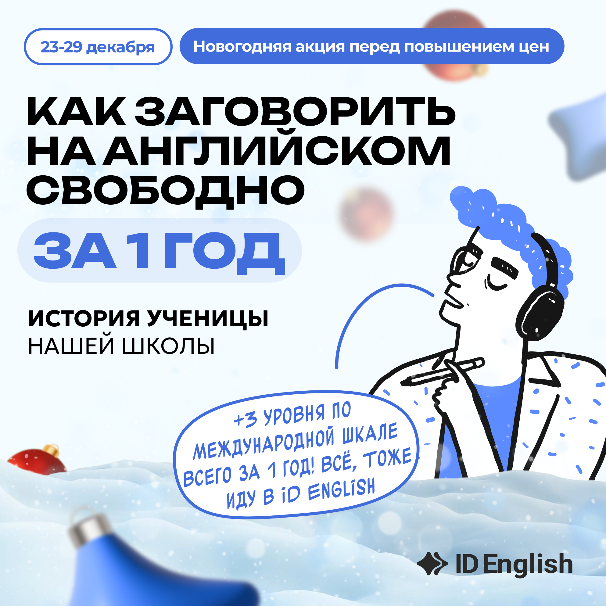 И у вас все получится.Прочитайте отзыв ученицы Анны. Она пришла в нашу школы почти без знаний и за 1 год выросла на +3 уровня по международной шкале: «Не могу поверить, что все сбылось. Я давно мечтала о том, чтобы учиться за границей. И сейчас благодаря ID English я стою у стойки регистрации в аэропорту. Я безумно благодарна, что всего за год я смогла улучшить свой English настолько, что прошла собеседование, сдала экзамен на английском и поступила.Спасибо всем педагогам ID English и особенно Анастасии за подаренную мне возможность так быстро выучить язык и исполнить свою мечту. Кстати, сейчас в дороге я смотрю уроки курса «Английский для путешествий и переезда». Этот курс тоже входит в мой тариф и как раз нужен мне сейчас. P.S. Сегодня в Москве я успела на английском: отшить иностранца, указать дорогу, помочь оплатить проезд в автобусе и уточнить, в ту ли стойку регистрации я стою. Как же я рада, что год назад выбрала именно вашу школу».Вы тоже так можете. ⏩ Приходите в нашу школу на тариф «Год английского свободный». И говорите уверенно уже в 2025 году. Длительность обучения на таком тарифе – 1 год (но доступ ко всем материалам, занятиям и практикам открыт на 1,5 года). Вы можете не торопиться, идти в своём темпе или возвращаться к уже пройденному материалу. - После окончания курса вы владеете грамматикой на интуитивном уровне, вашего словарного запаса достаточно для общения даже с носителями, вы уверенно говорите и у вас понятное произношение.