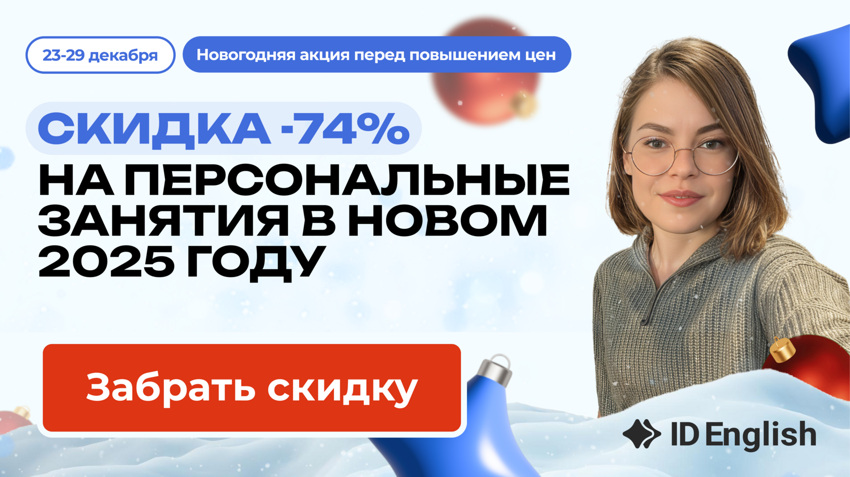 2️⃣ Такой стоимости уже не будет. -74% на английский действует только до вечера. Ровно в 23:59 продажи закроются. А с 1 января будет повышение стоимости всех наших курсов в 1,5-2 раза.