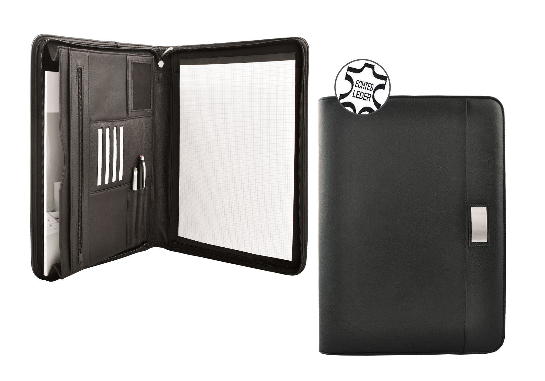 Konferenzmappe mit Reissverschluss und edlem Geschenkkarton schwarz, schwarzes weiches Echtleder A1180-AA1142-05