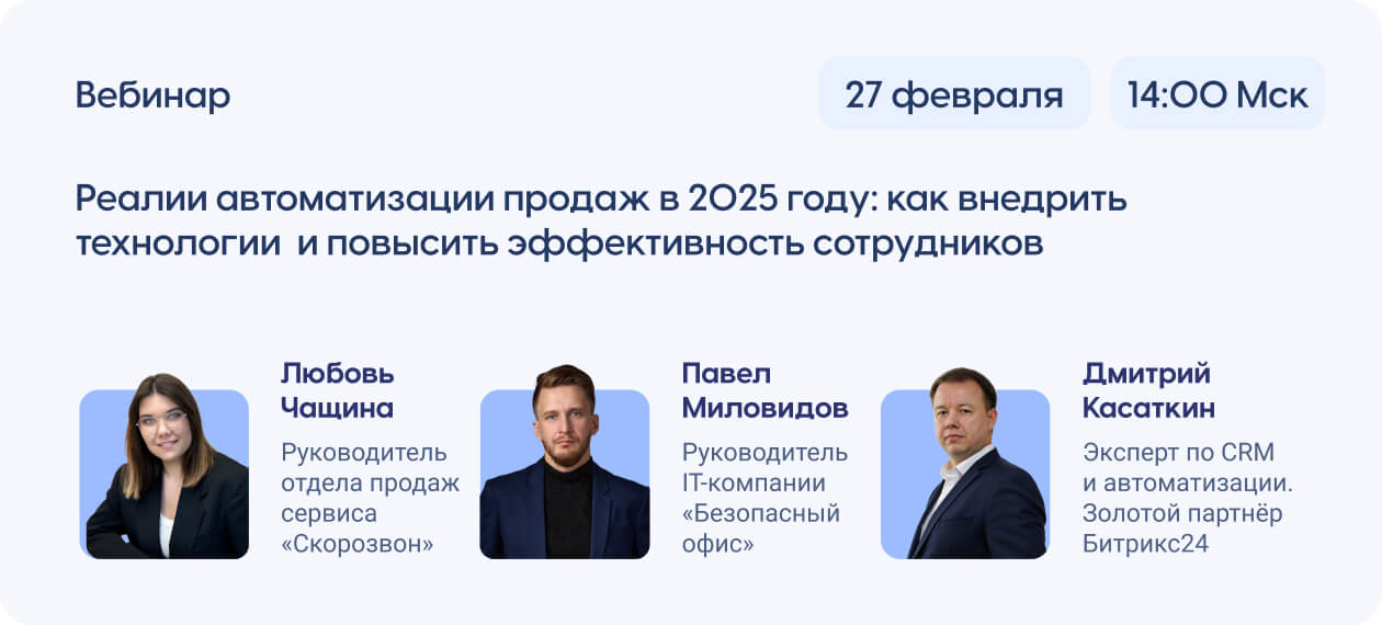 «Реалии автоматизации продаж в 2025 году: как внедрить технологии и повысить эффективность сотрудников» 27 февраля 2025 года в 14:00 мск, на котором Любовь Чащина, руководитель отдела продаж сервиса «Скорозвон», выступит одним из спикеров с темой