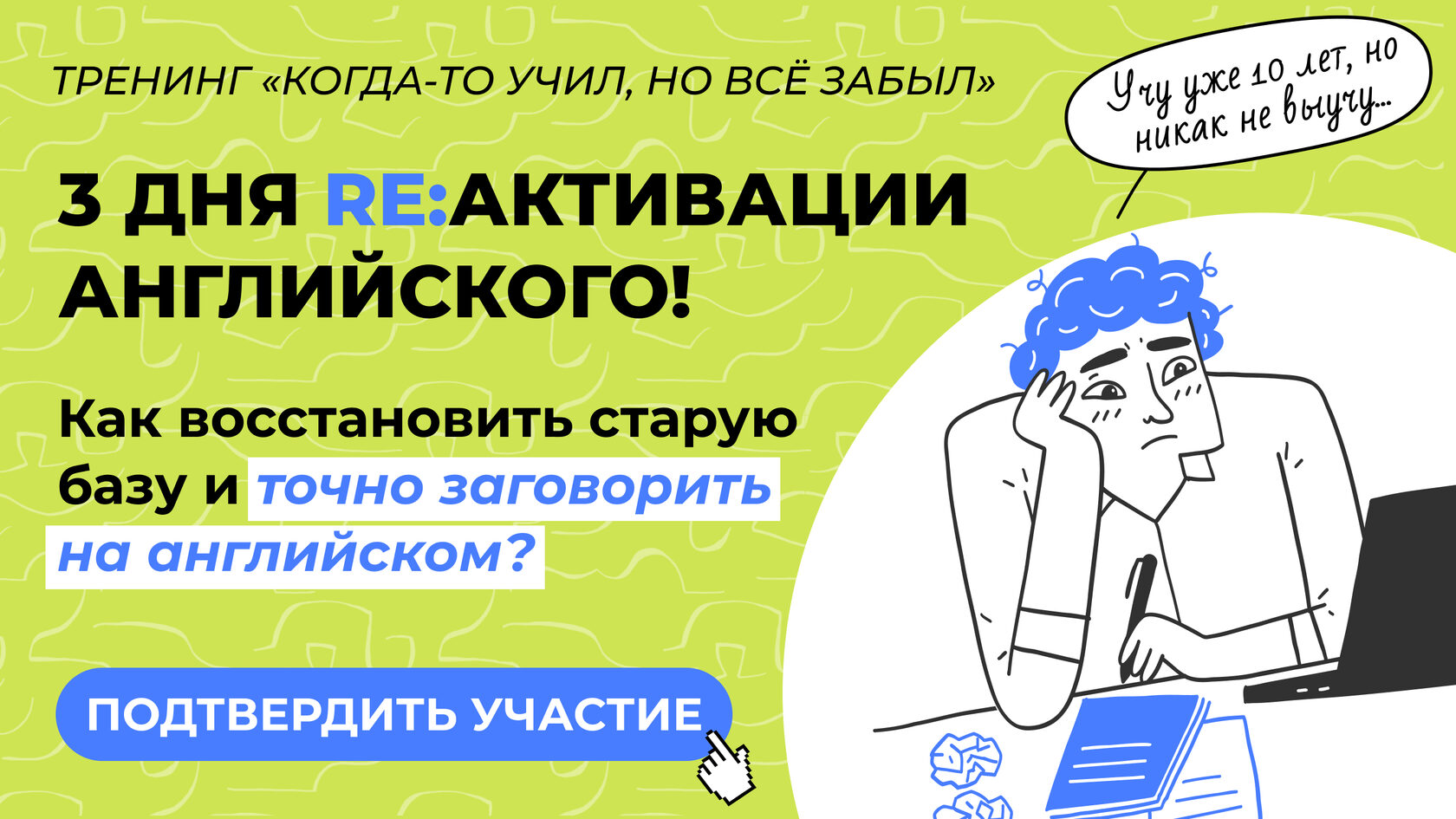 Сейчас мы проводим финальное безоплатное обучение этой зимы – тренинг английского для тех, кто когда-то учил, но всё забыл «Реактивация английского за 3 дня!». Начинаем завтра!