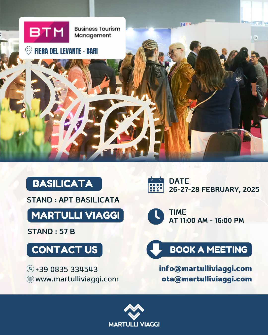 🇮🇹 Siamo alla BTM 2025! 🚀 Dal 26 al 28 febbraio, ti aspettiamo alla Fiera del Levante di Bari, dalle 11:00 alle 16:00, per parlare di turismo e nuove opportunità! 🏝️ 📌 Ci trovi allo stand 57B Martulli Viaggi e allo stand APT Basilicata. Vuoi fissare un incontro? Prenotalo ora! Scrivi a info@martulliviaggi.com o ota@martulliviaggi.com. 🇬🇧 We are at BTM 2025! 🚀 From February 26th to 28th, join us at the Fiera del Levante in Bari, from 11:00 AM to 4:00 PM, to discuss tourism and new opportunities! 🏝️ 📌 Find us at stand 57B Martulli Viaggi and APT Basilicata stand. Want to schedule a meeting? Book now! Email us at info@martulliviaggi.com or ota@martulliviaggi.com |