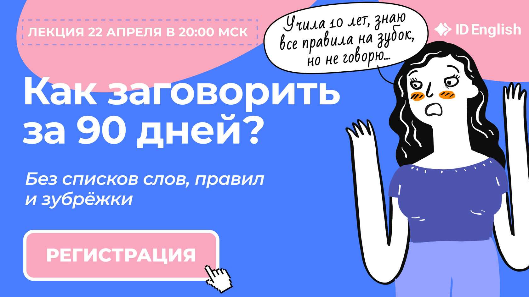 Как это возможно и по какой методике нужно заниматься я расскажу на живом вебинаре «Английский за 90 дней: от базы до уверенного общения». Проведу его 22 апреля в 20.00 по мск. | | | | Я понимаю, что вы привыкли учить английский годами – 10 лет в школе, потом 4-5 лет в институте, репетиторы, курсы. И поэтому вам сложно поверить, что результата можно достичь всего за 3 месяца. Но это так!