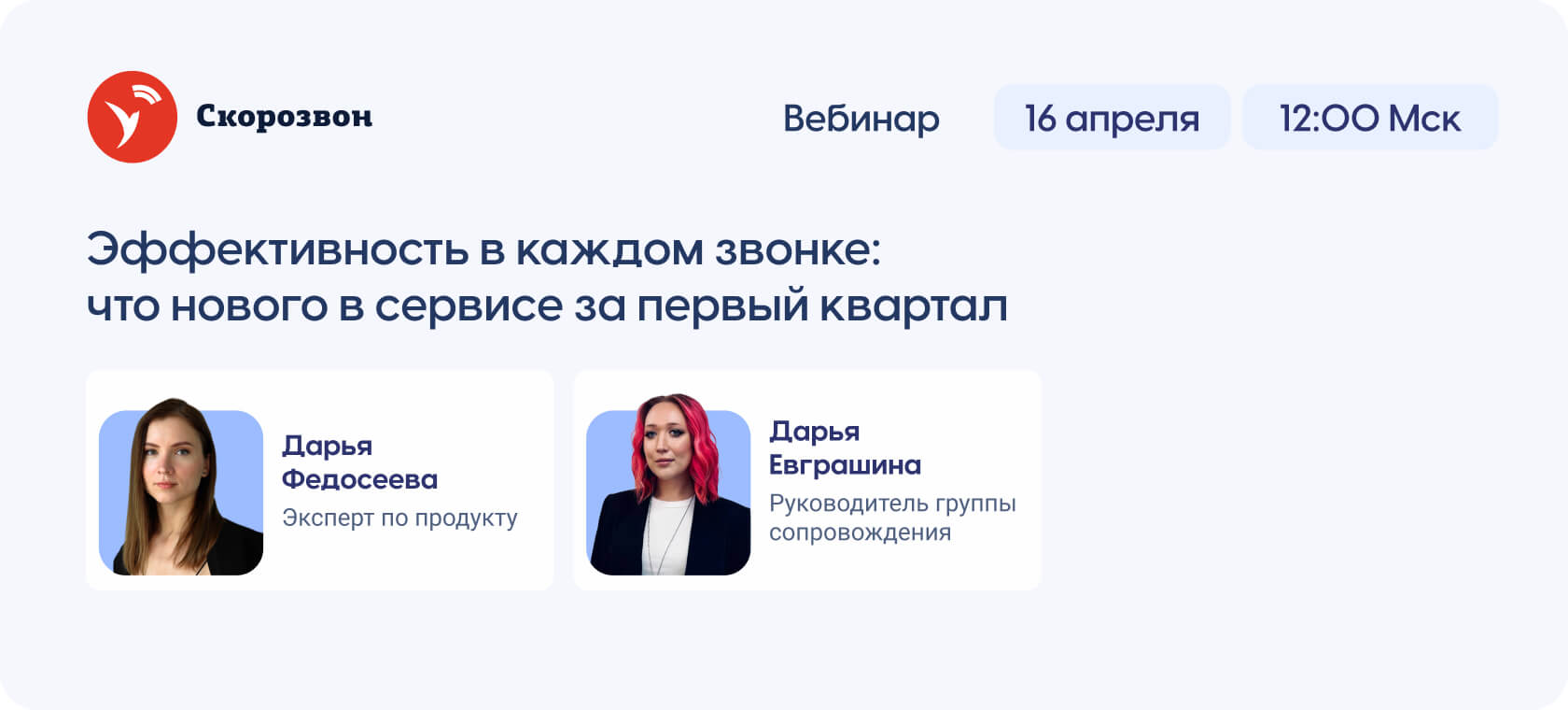 | | ключевые изменения в первом квартале 2025: новые настройки безопасности, апдейт интерфейса и другие возможности; | | | | оптимизацию бизнес-процессов: как переводить звонки на группу сотрудников, передавать идентификаторы amoCRM в Скорозвон и не только; | | | | нововведения в функционале: как отследить динамику контактности каруселей, выгрузить отчёт и посмотреть транскрибацию диалога робота с клиентом прямо в карточке; | | | | планы на ближайшие обновления: продолжим работу над ускорением бизнес-процессов и функционалом сервиса. | | | | | В конце встречи сможете задать вопросы и обсудить свои задачи в кругу экспертов и коллег. | | | | | Дарья Федосеева | | эксперт по продукту | | | | Дарья Евграшина | | руководитель группы сопровождения | | | | Регистрируйтесь и откройте новые возможности для повышения эффективности вашей команды! | | | | Увидимся на вебинаре! Команда Скорозвона | | | |