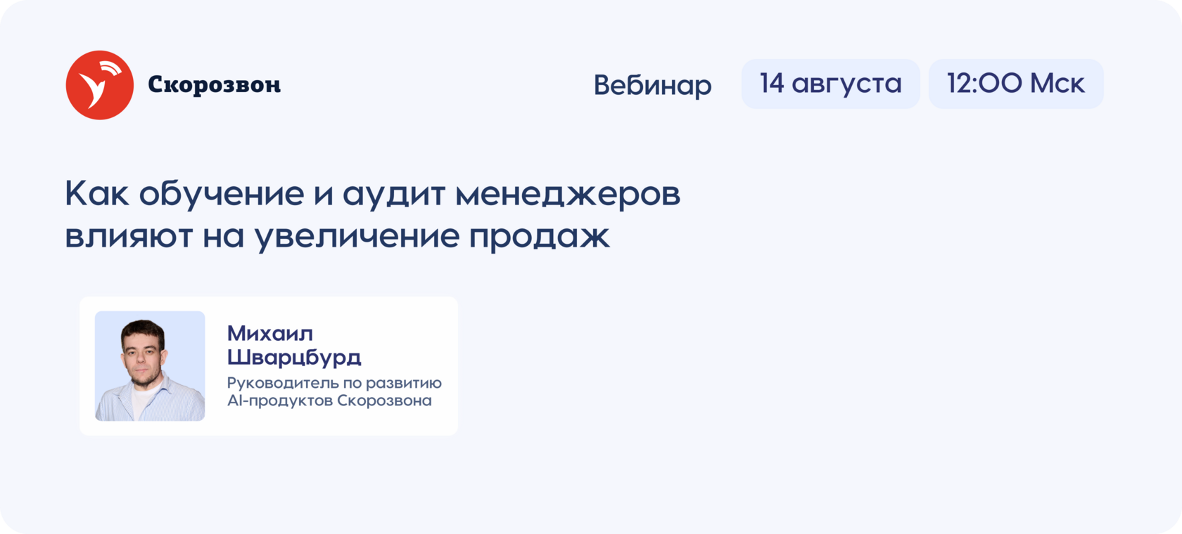 Приглашаем на вебинар «Как обучение и аудит менеджеров влияют на увеличение продаж» с Михаилом Шварцбурдом, руководителем по развитию AI-продуктов сервиса «Скорозвон». Встретимся онлайн 14 августа 2025 года в 12:00 мск.