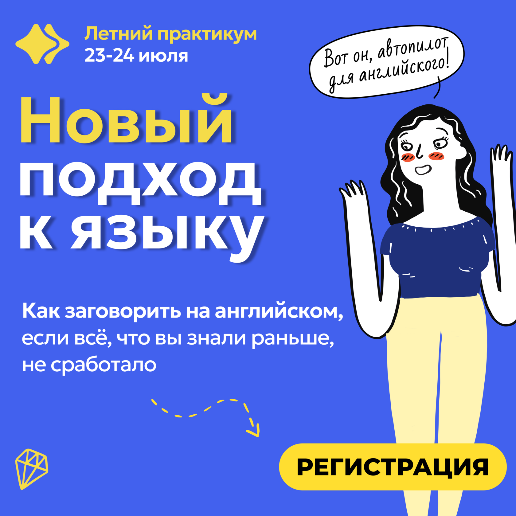 ✨ Поэтому — я решила выйти в эфир ещё раз. Практикум «Английский на автопилоте: чтобы понимать и говорить уверенно» пройдёт снова — 23 и 24 июля в 12:00, 15:00 и 20:00 мск. Программа совершенно уникальная. Я ее делала с учетом фишек, которые узнала за время преподавания в американском университете. Такую информацию в интернете не найти. | | | ✋ За два дня летнего практикума я перепрошью ваш мозг так, чтобы вы начали говорить на английском автоматически. Без зубрежки и без перевода в голове. Говорить сразу интуитивно – так, как это делают дети, когда осваивают новый язык. Это не вызывает у них никаких трудностей. Они не думают о том, как собрать фразу, какое время использовать, а какой предлог тут нужен – они просто общаются. И вы тоже так можете – можете говорить на английском, будто на автопилоте, без зависания и без перевода в голове. Да, это реально. И для этого не нужно знать все слова и грамматику, не нужны какие-то особые склонности или годы учебы.Что вы узнаете на летнем практикуме:- Как перестать переводить в голове и начать думать на английском.