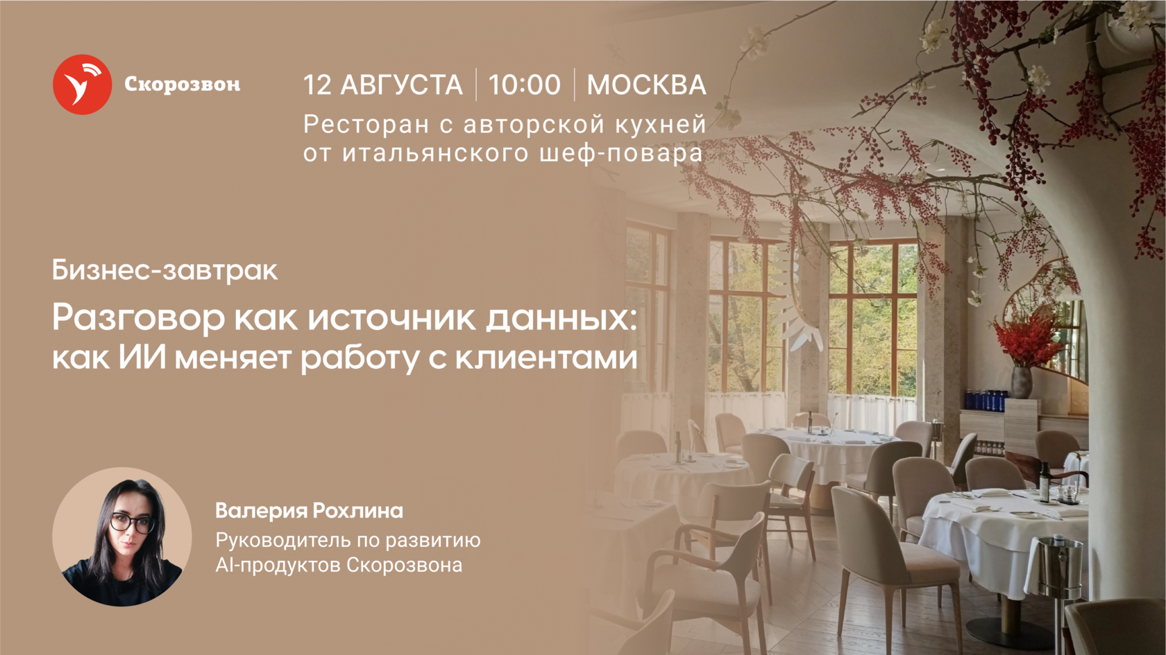 Приглашаем вас на бизнес-завтрак «Разговор как источник данных: как ИИ меняет работу с клиентами». Участники встречи в числе первых познакомятся с обновлённой версией речевой аналитики Скорозвона на базе AI.