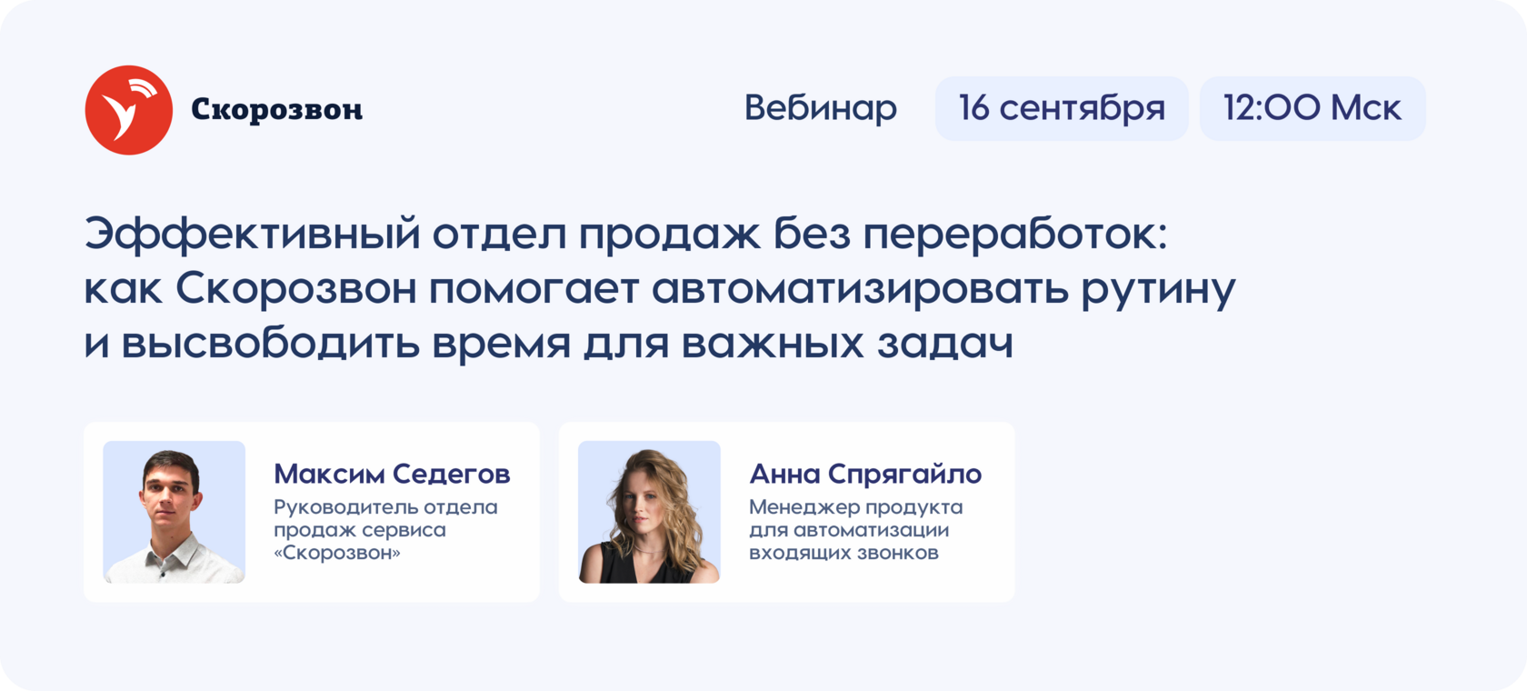 Через час — в 12:00 мск — встречаемся на вебинаре «Эффективный отдел продаж без переработок: как Скорозвон помогает автоматизировать рутину и высвободить время для важных задач». Подключайтесь по ссылке ниже. | | | | | Как автоматизация звонков позволяет не только сокращать операционные расходы, но и наращивать доход за счёт повышения дозваниваемости, благодаря исключению автоответчиков. | | | | Как правильная организация входящей линии позволяет не терять заявки и создавать возможность для продаж уже заинтересованным клиентам. | | | | Как AI-инструменты Скорозвона помогают быстрее обучать сотрудников, выявлять полезные инсайты из диалогов с клиентами и улучшать качество отработки возражений. | | | | Кейсы компании «ЭЛТА», МКК «Айва» и АО «Зетта Страхование»: как работали до Скорозвона и каких результатов достигли после внедрения технологических решений. | | | | | Увидимся на вебинаре! Команда Скорозвона | | | |