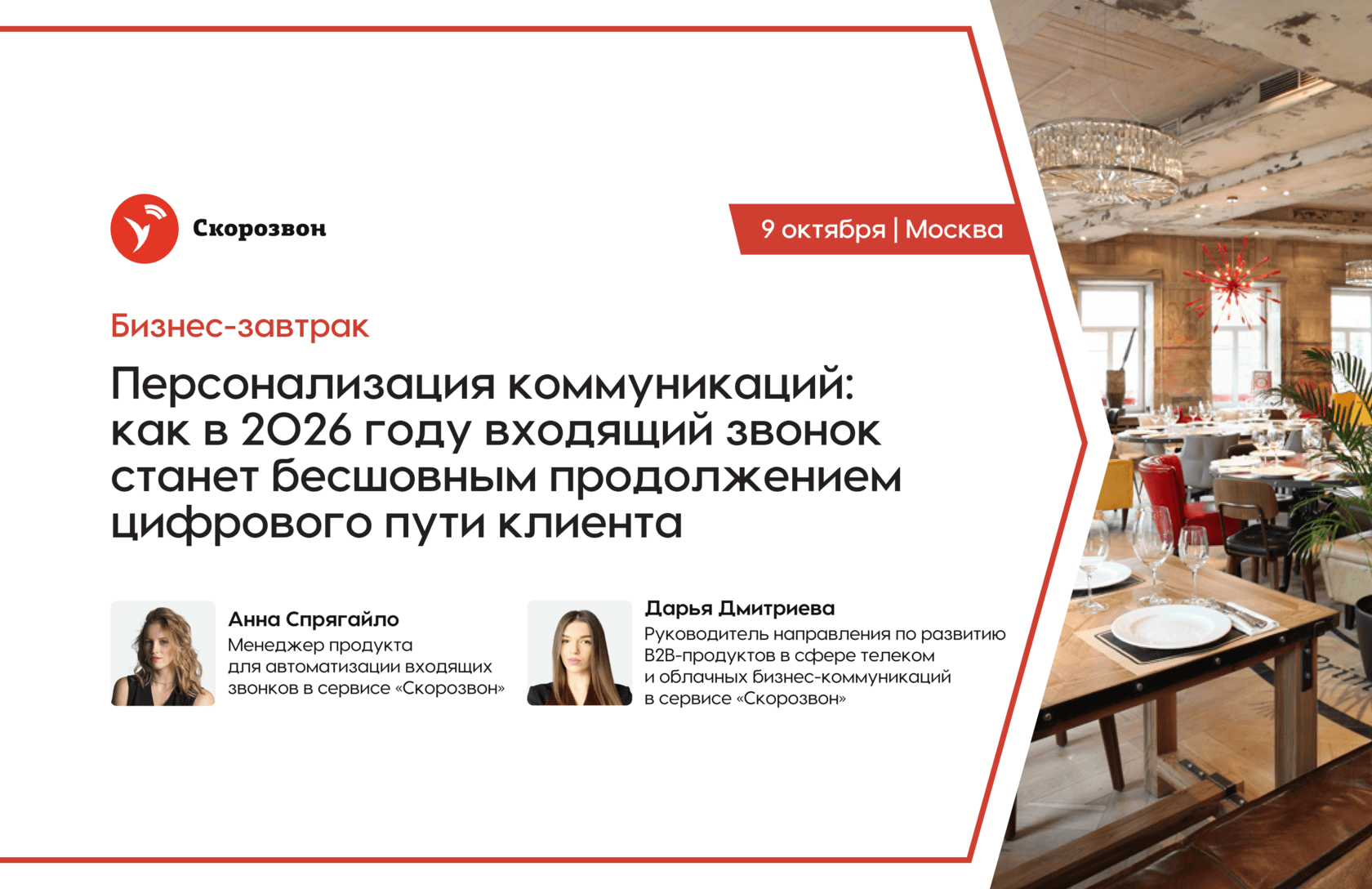Приглашаем вас на бизнес-завтрак «Персонализация коммуникаций: как в 2026 году входящий звонок станет бесшовным продолжением цифрового пути клиента», который состоится 2 октября 2025 года в Москве. Обсудим, как современные технологии меняют практику телефонных коммуникаций.