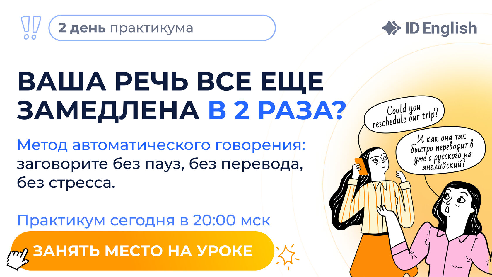 Знаете, в чем главное отличие между человеком, который «учит английский», и тем, кто на нем реально говорит? Не в количестве слов. Не в идеальной грамматике. Даже не в акценте. А в том, что второй даже не замечает, как переключается на английский. Как когда вы ведете машину и не думаете: «Сейчас нажму педаль, потом поверну руль». Вы просто едете. ⏩ Сегодня в 20:00 мск стартует 2-й день интенсивного практикума«Английский на автопилоте: как выйти на уровень, когда ты даже не замечаешь, что говоришь», и вы всё ещё можете на него успеть. Мы разберёмся с тем, что мешает вам говорить свободно и быстро, и научим вас переходить на «автопилот». | | | ✅ На уроке разберём:- Как ускорить вашу речь и говорить без остановок, без заиканий и без лишнего напряжения.