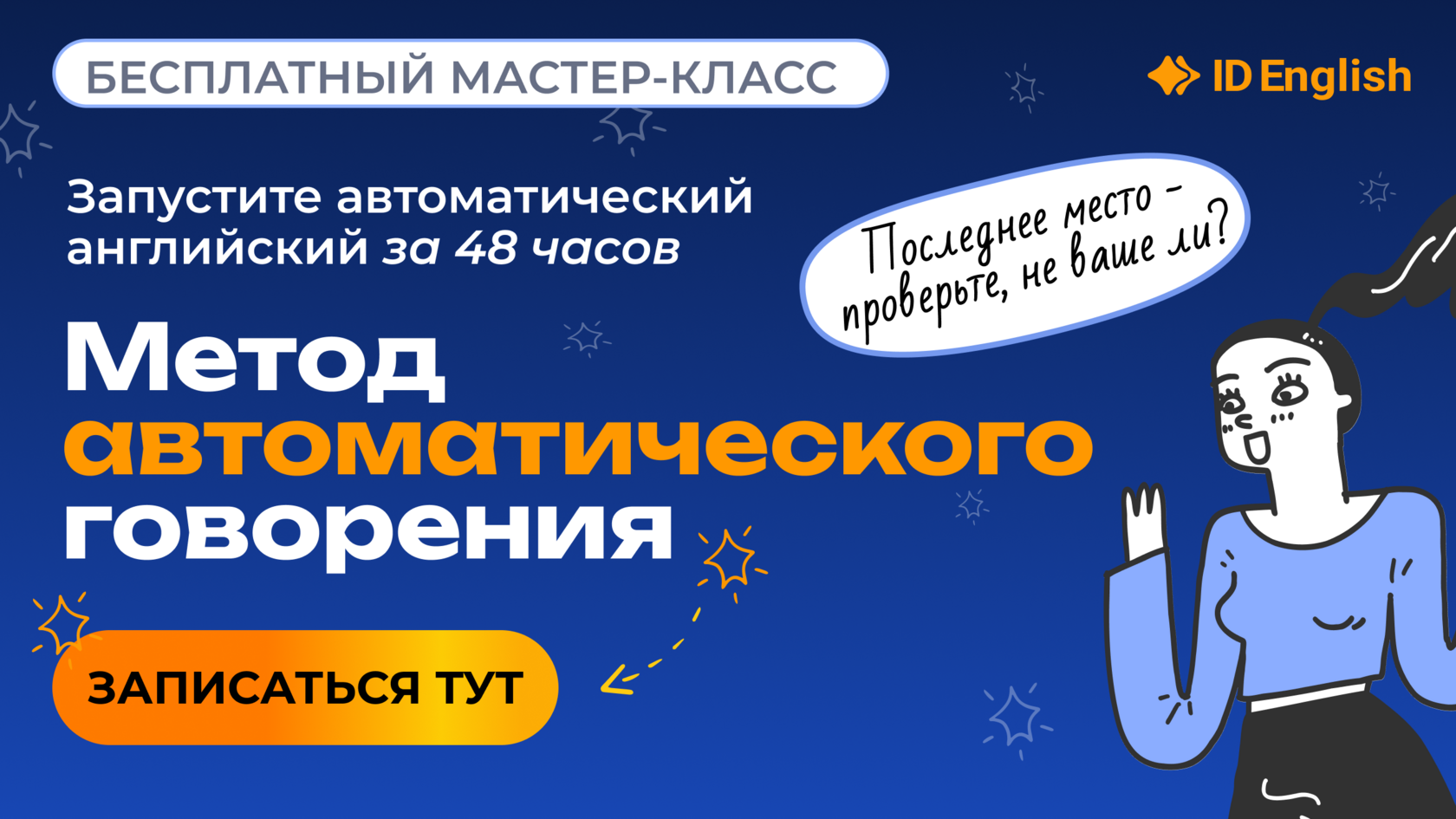 Если согласны — регистрируйтесь на мастер-класс «Метод автоматического говорения»: запустите автоматический английский за 48 часов — без зубрёжки, без учебников и без стресса.