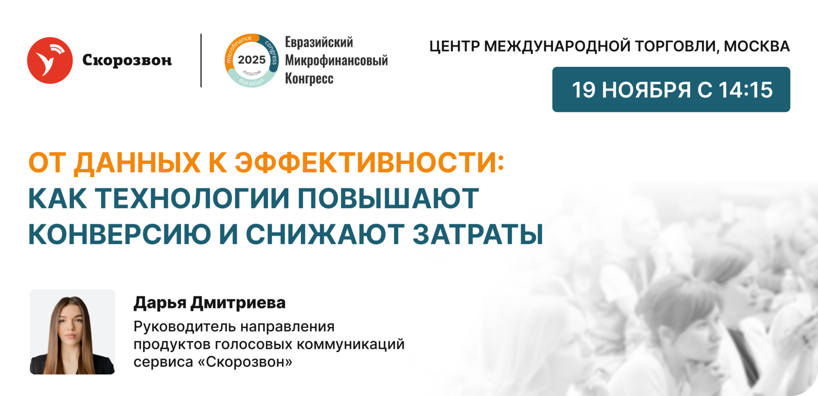 Выступление состоится 19 ноября в рамках сессии №2 «Цифровое МФО. Интеллектуальные сервисы и технологии отрасли». Блок презентаций пройдёт с 14:15 до 16:00.