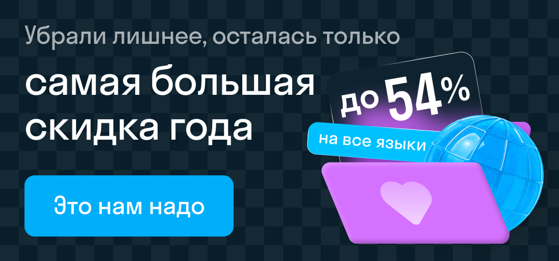 | Пришла Чёрная пятница. А вместе с ней — самые большие скидки года! Используйте промокод ПЯТНИЦА и занимайтесь английским и другими иностранными языками с максимальной выгодой. | | | |