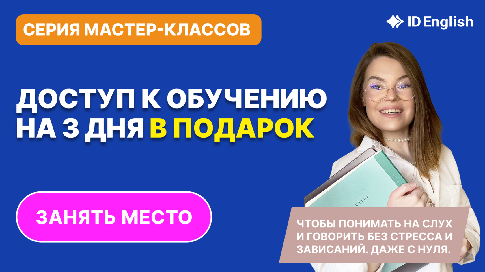 Сделаем 3 мощнейших упражнения, которые помогут поставить понятную речь.если у вас совсем нет времени. И вы можете выделить на занятия только 20 минут! После регистрации вас ждут 3 важных мини-задания, которые помогут мне сделать эфиры максимально полезными именно для вас. Не пропустите ❤️ Чтобы посетить интенсив и стать учеником ID English без оплаты, не забудьте записаться. Это займёт всего полминуты. | | | | *Советуем поспешить, осталось всего 11 из 60 мест без оплаты! Потом участие станет по 19 500 р.