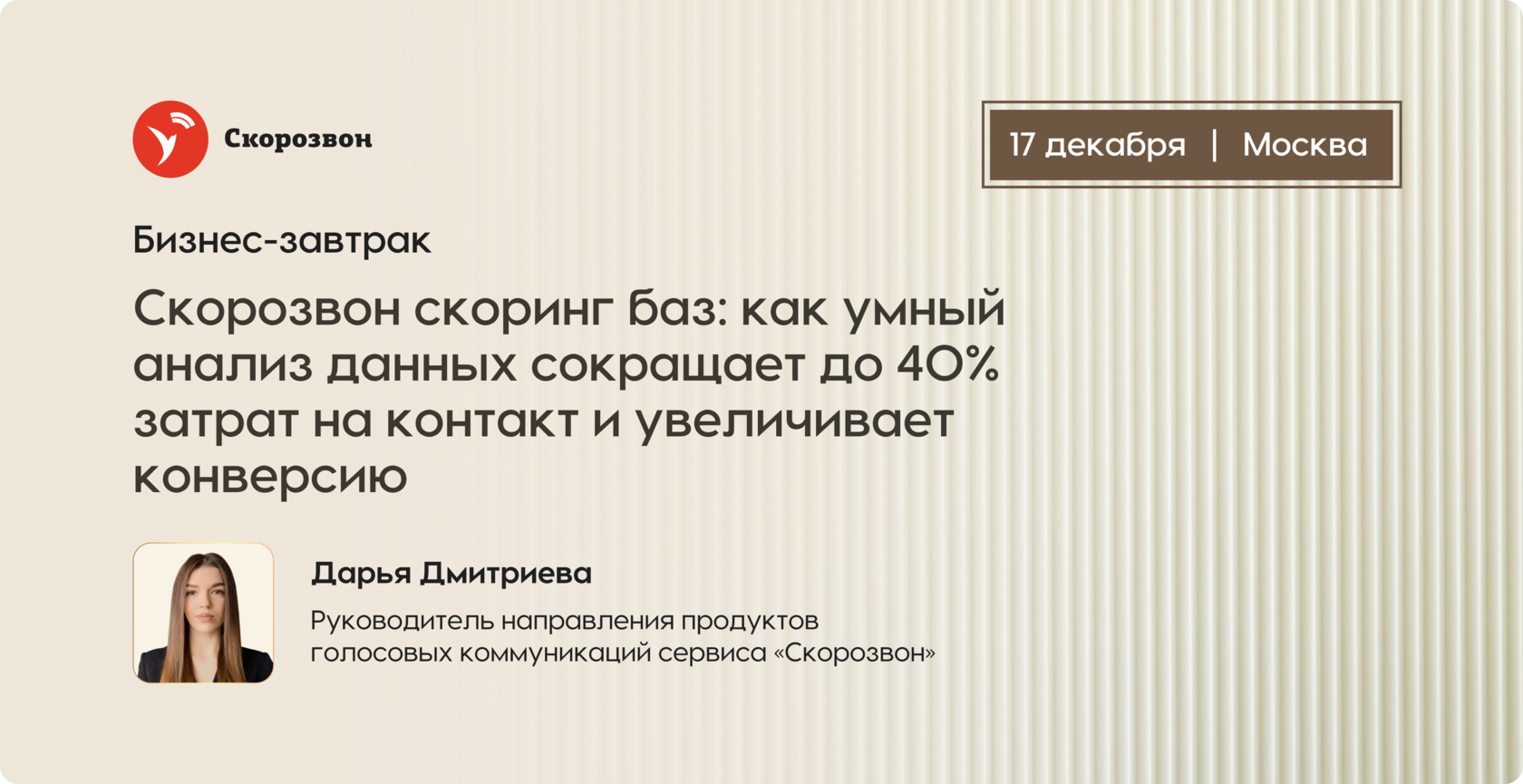 Приглашаем вас на бизнес-завтрак «Скорозвон скоринг баз: как умный анализ данных сокращает до 40% затрат на контакт и увеличивает конверсию», который состоится в 10:00 мск 17 декабря 2025 года в Москве.